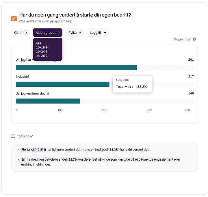 Innsiktsrapporten gir deg både en rask oppsummering og muligheten til å utforske data i dybden. Filtrer, sammenlign og gå ned i detaljer — mens KI-modellen vår hjelper deg å oppdage mønstre du ellers ville gått glipp av.
